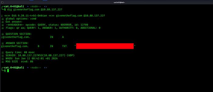 The goal is to query a specific DNS server correctly in order to retrieve a hidden flag stored in a DNS record.